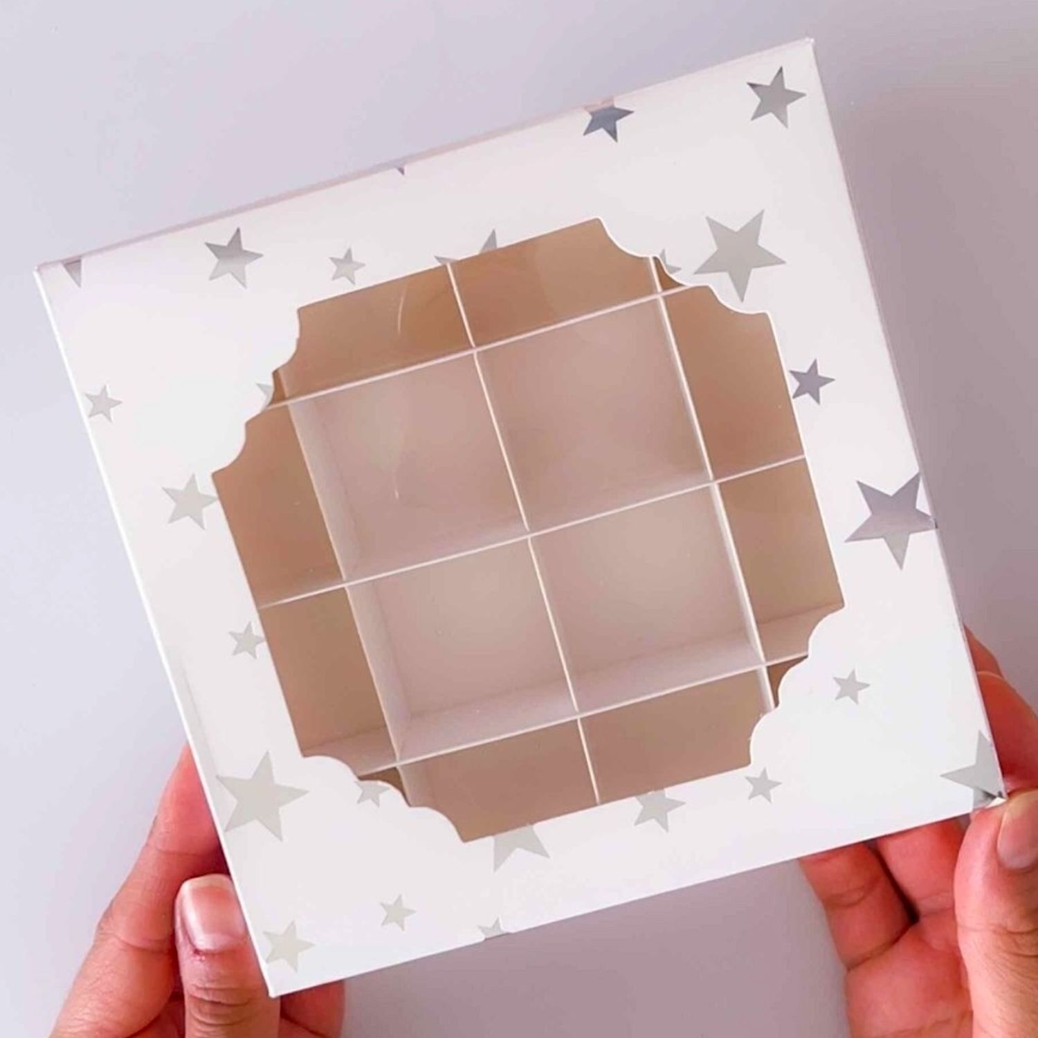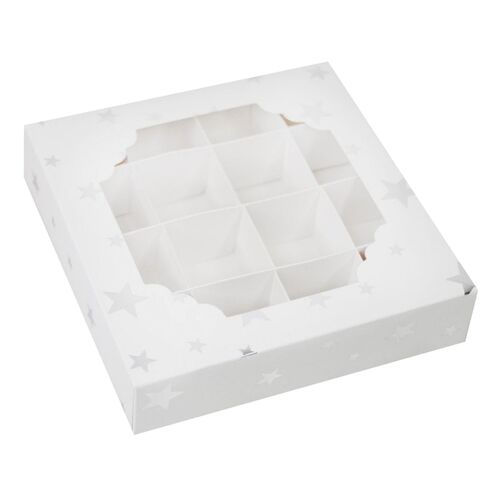 Dank der 16 Fächer bleiben Ihre Süßigkeiten an ihrem Platz, wodurch ein Verrutschen verhindert wird und eine ordentliche und elegante Präsentation gewährleistet ist. Der Deckel mit transparentem Fenster ermöglicht es Ihnen, Ihre Produkte zu präsentieren, ihre Schönheit hervorzuheben und die Aufmerksamkeit derjenigen auf sich zu ziehen, die sie erhalten oder kaufen.