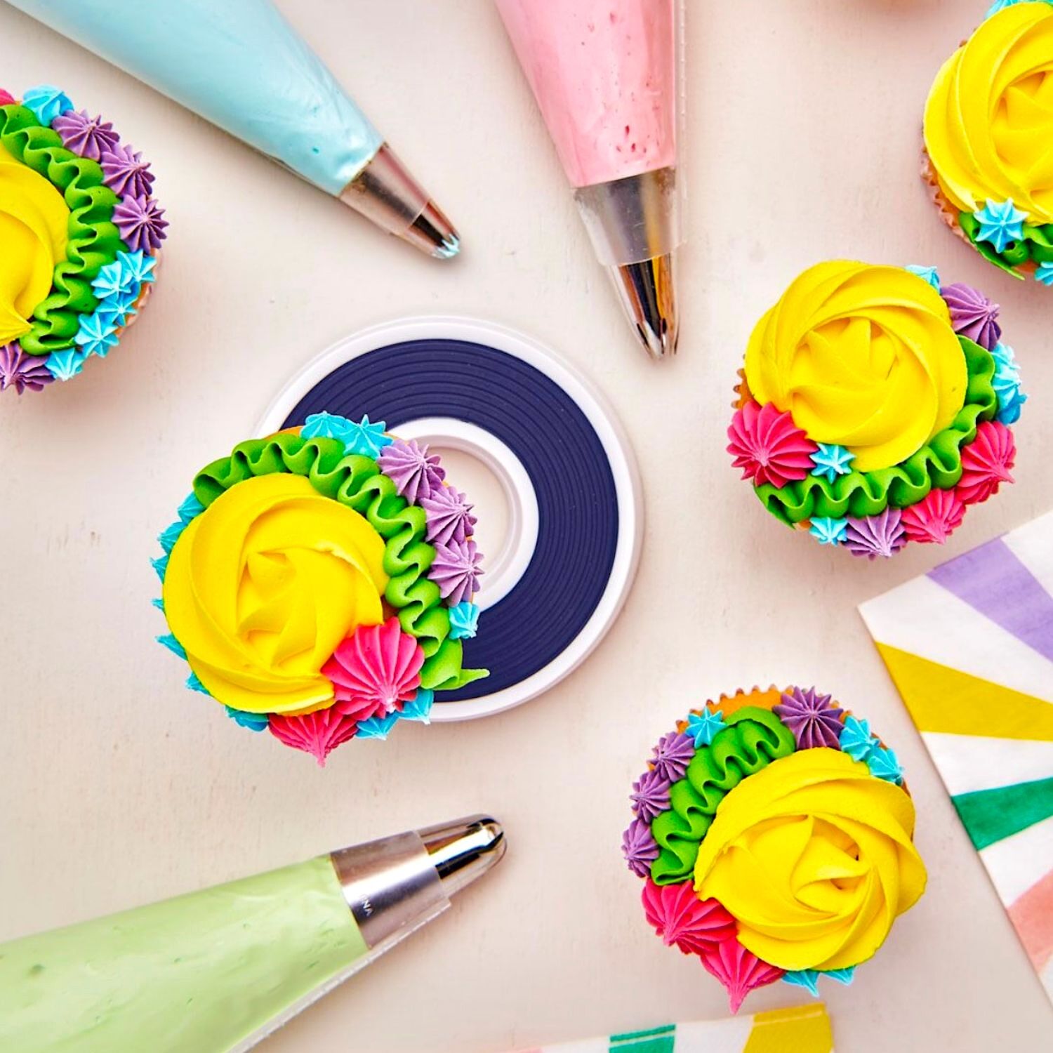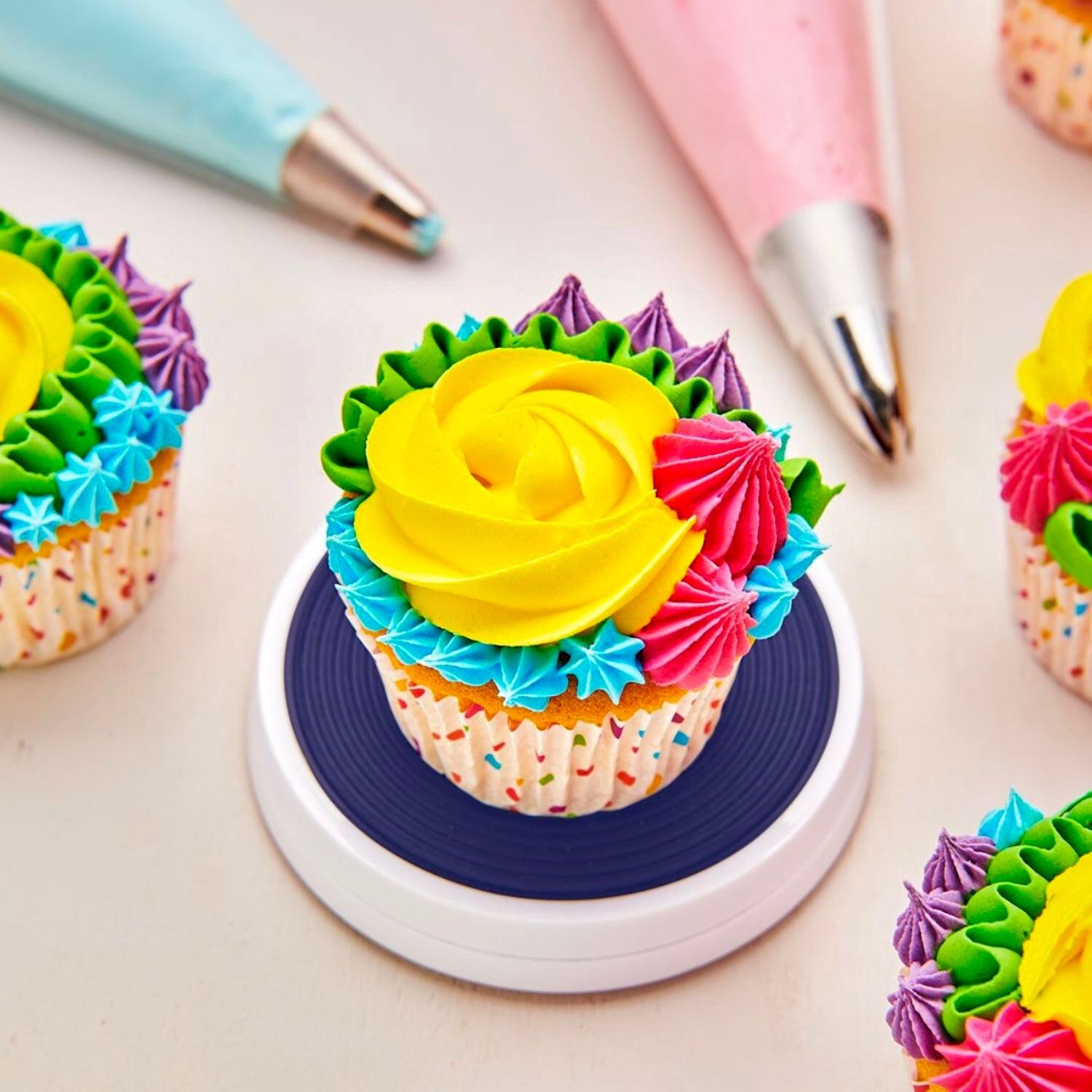 Dieser kompakte Drehteller wurde speziell für die Arbeit mit Cupcakes, Keksen und kleinen Torten entwickelt und bietet Komfort und Präzision selbst bei den feinsten Details.